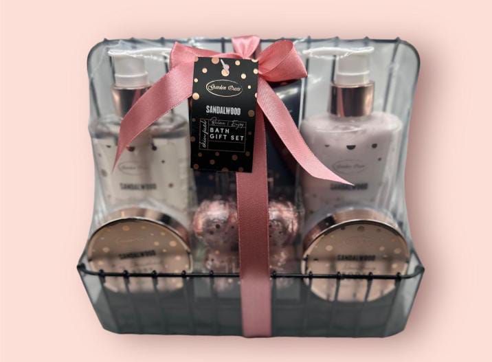 "استمتعي بالرفاهية والاسترخاء مع مجموعة هدايا استحمام بخشب الصندل، المصممة لتحفيز الحواس وتغذية بشرتك بعمق."